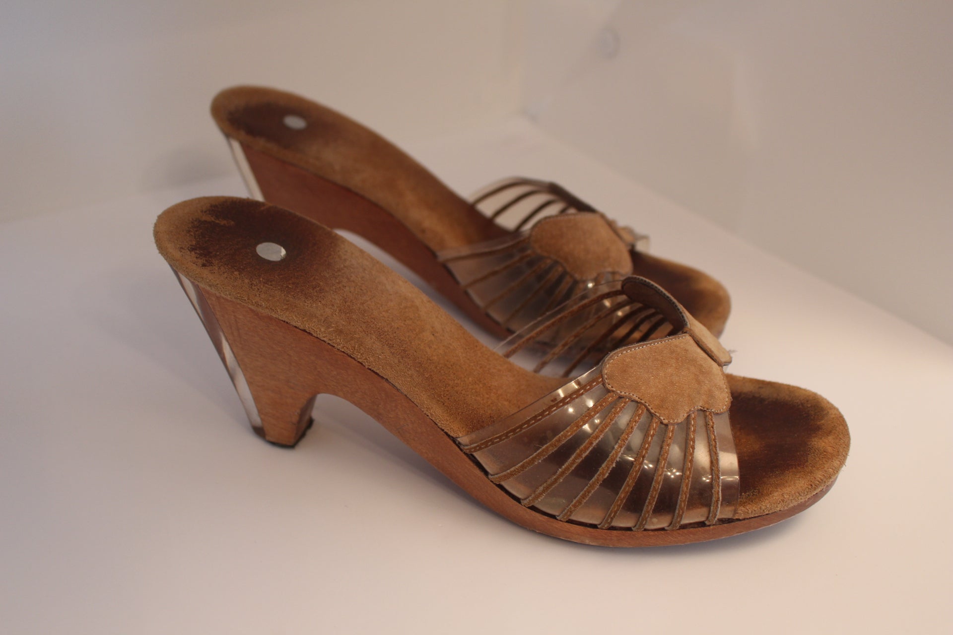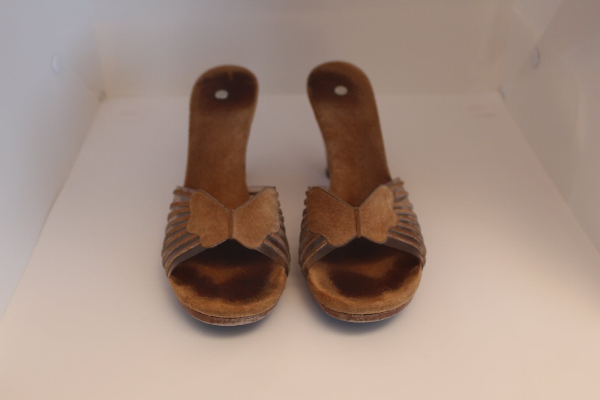 Bring back the 70's with these amazing brown butterfly clog shoes.